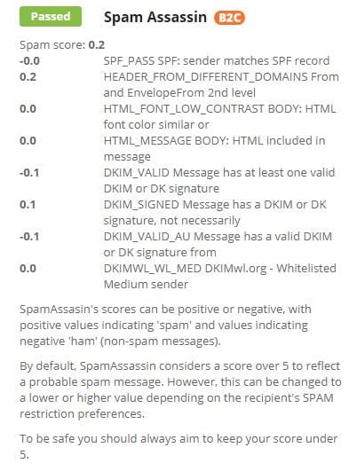 When Email on Acid runs a SpamAssassin test during deliverability checks, we use the default score of “5” to provide a pass/fail result on that particular email.