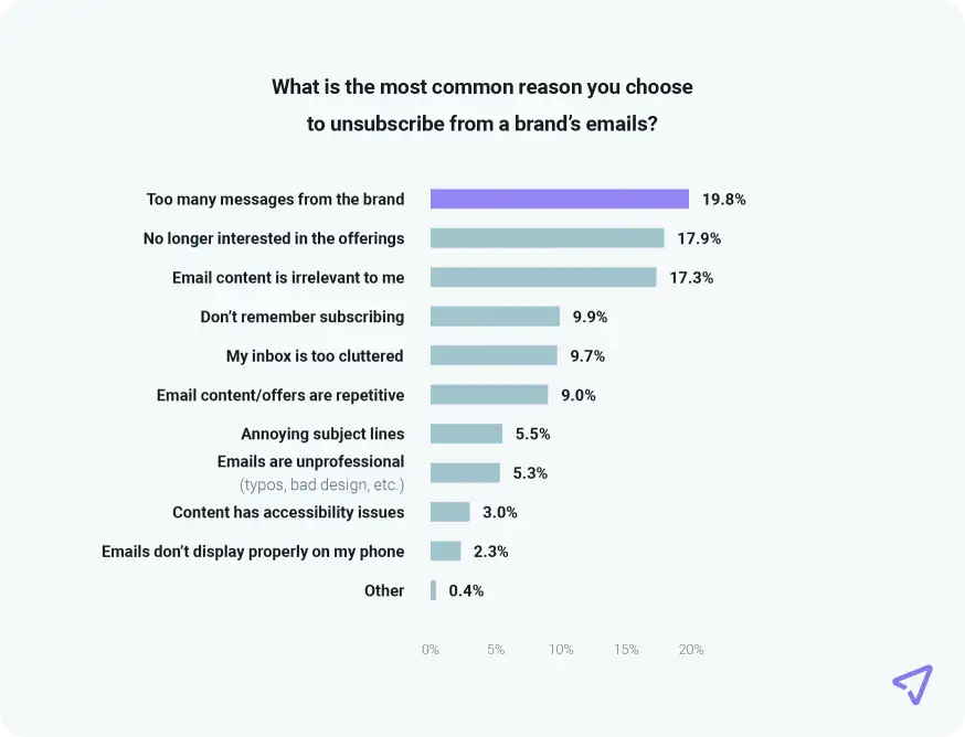 Combined, those three reasons for unsubscribing from a brand’s emails represent 55% of the total. However, other reasons on the list also reflect things that annoy and frustrate subscribers.